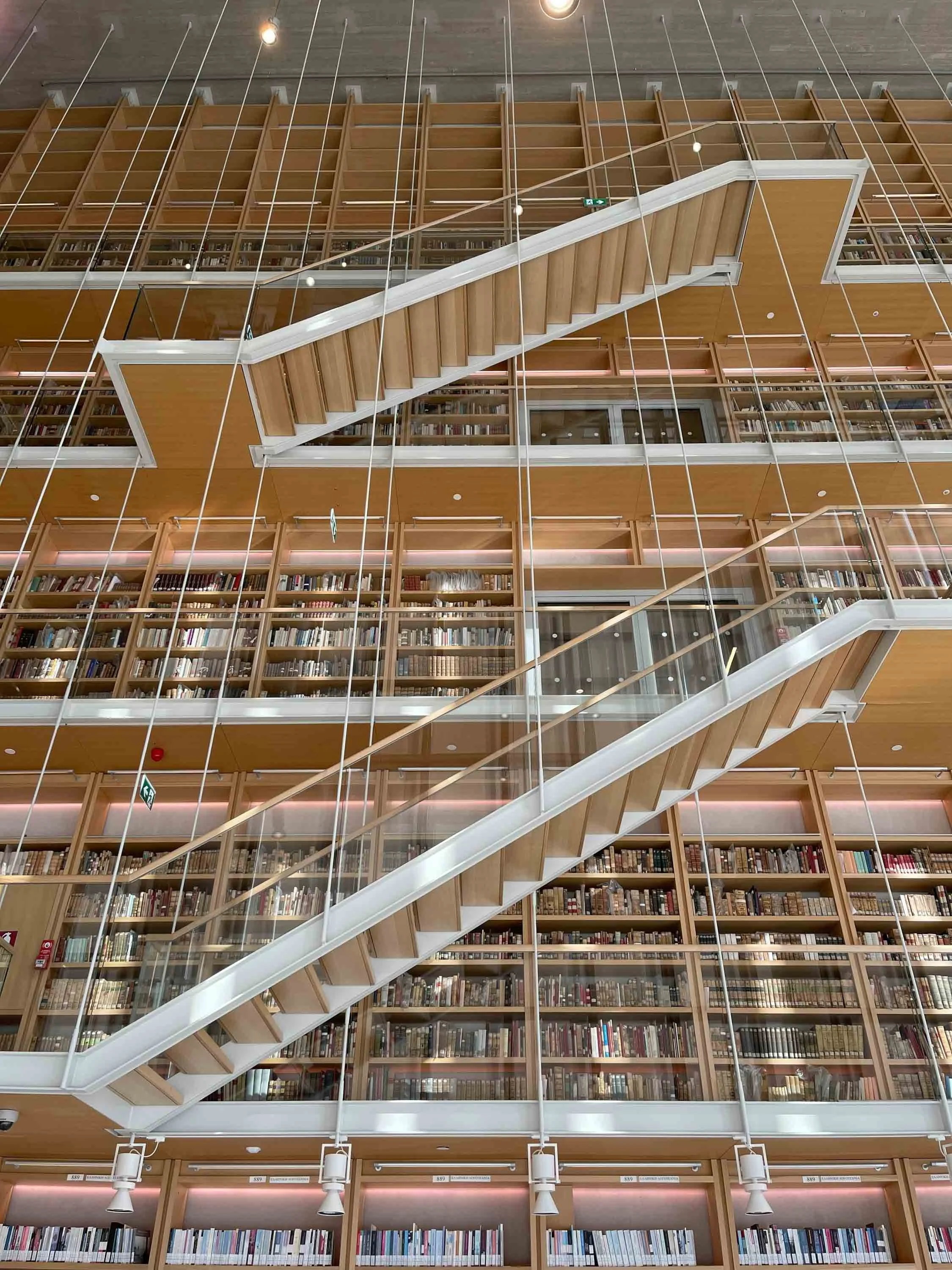 Multiple floors of a modern library with glass railings and wooden stairs, filled with shelves of books.